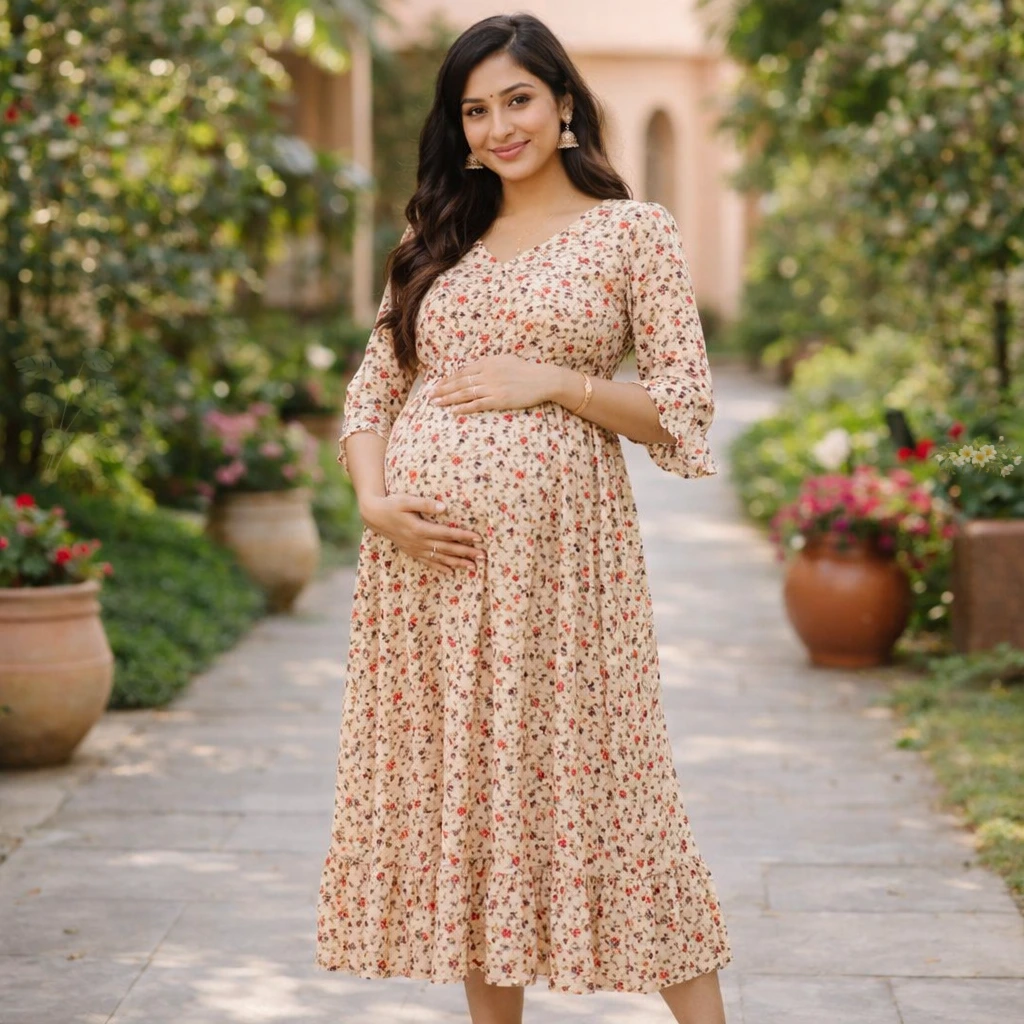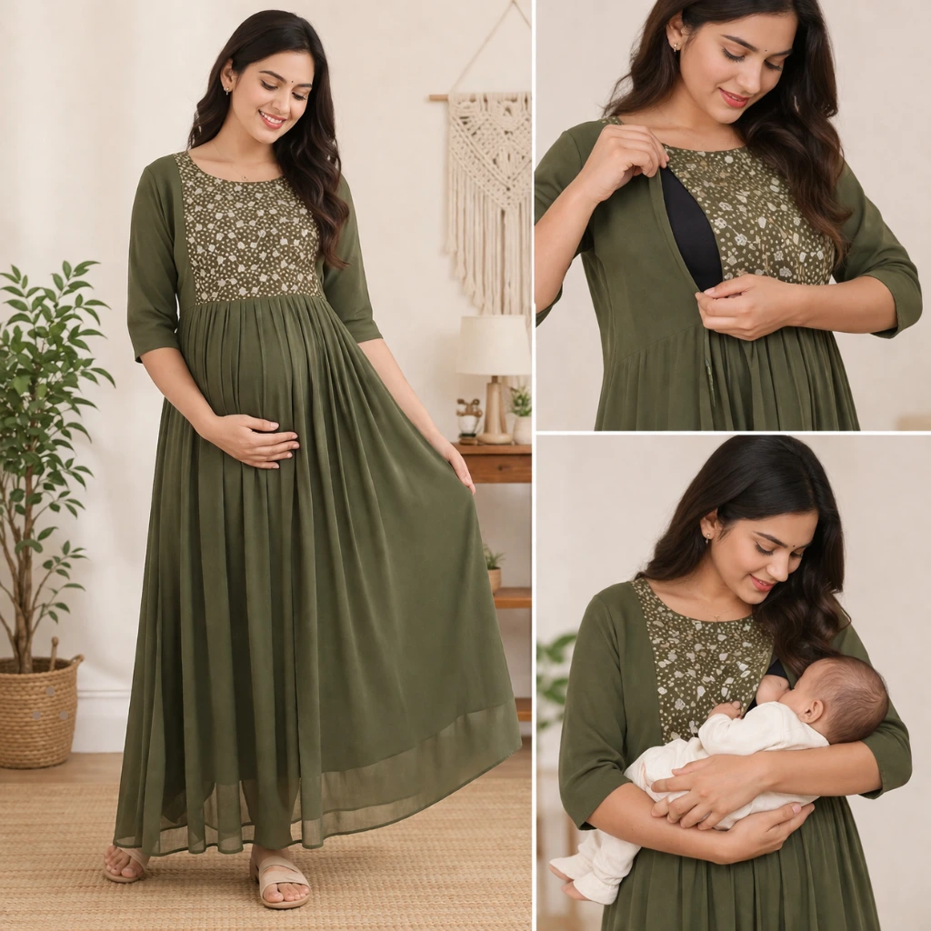 A feeding Anarkali dress combines traditional elegance with smart feeding functionality. It includes hidden zippers or layers that make breastfeeding easy while maintaining a rich ethnic look.