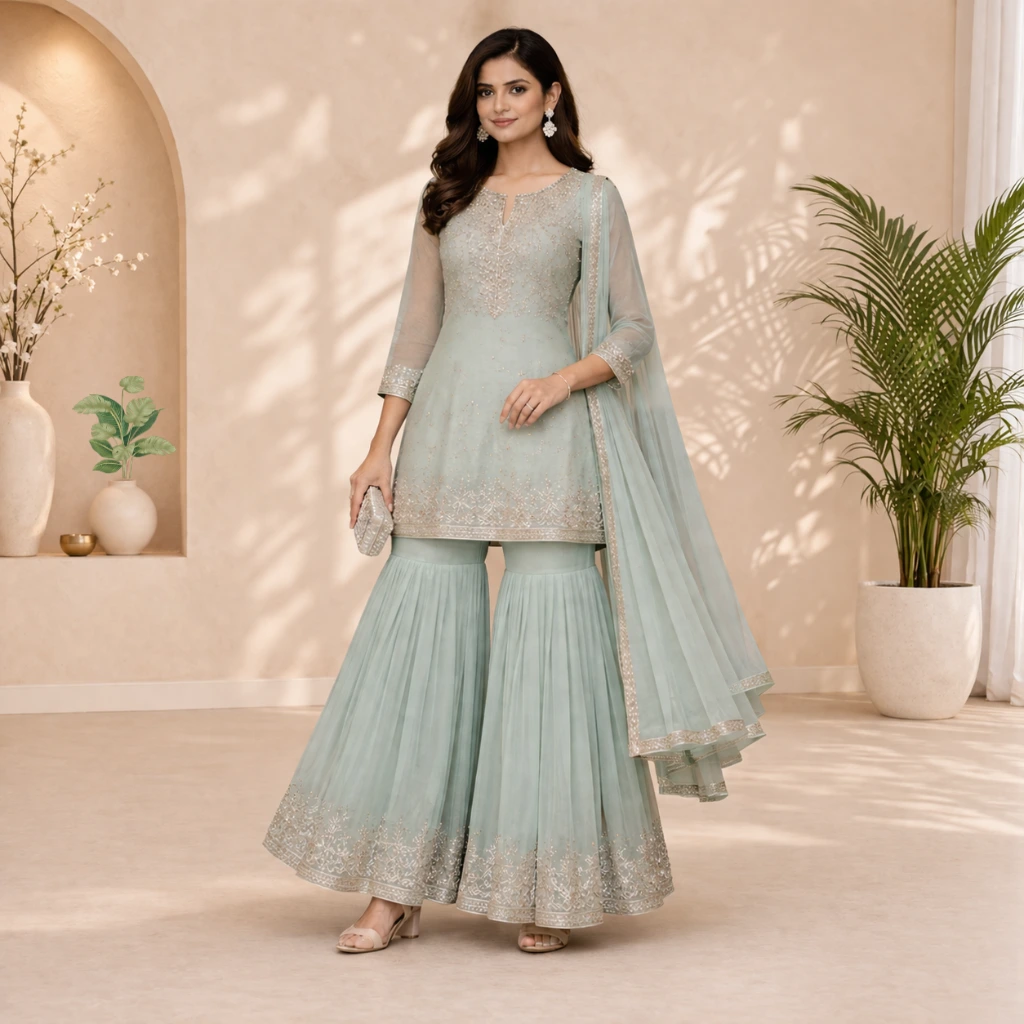Sharara Salwar Suit is a festive favorite outfit known for its wide flared pants that create a beautiful and graceful flow while walking. This traditional yet trendy style gives a perfect blend of royal elegance and modern fashion.